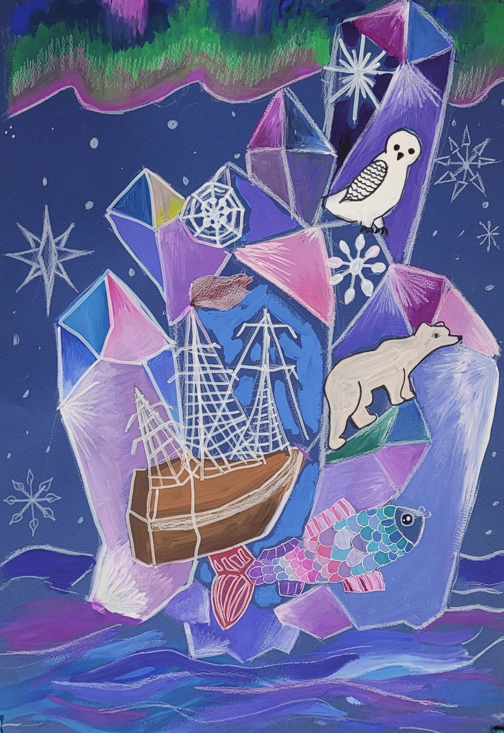 Аннотация: Я представила, что смотрю на Север, приставив к глазу маленький кристаллик. И увидела: величественного белого медведя, полярную сову, старинный корабль путешественников, затёртый во льдах, красивую рыбу и необыкновенное северное сияние!