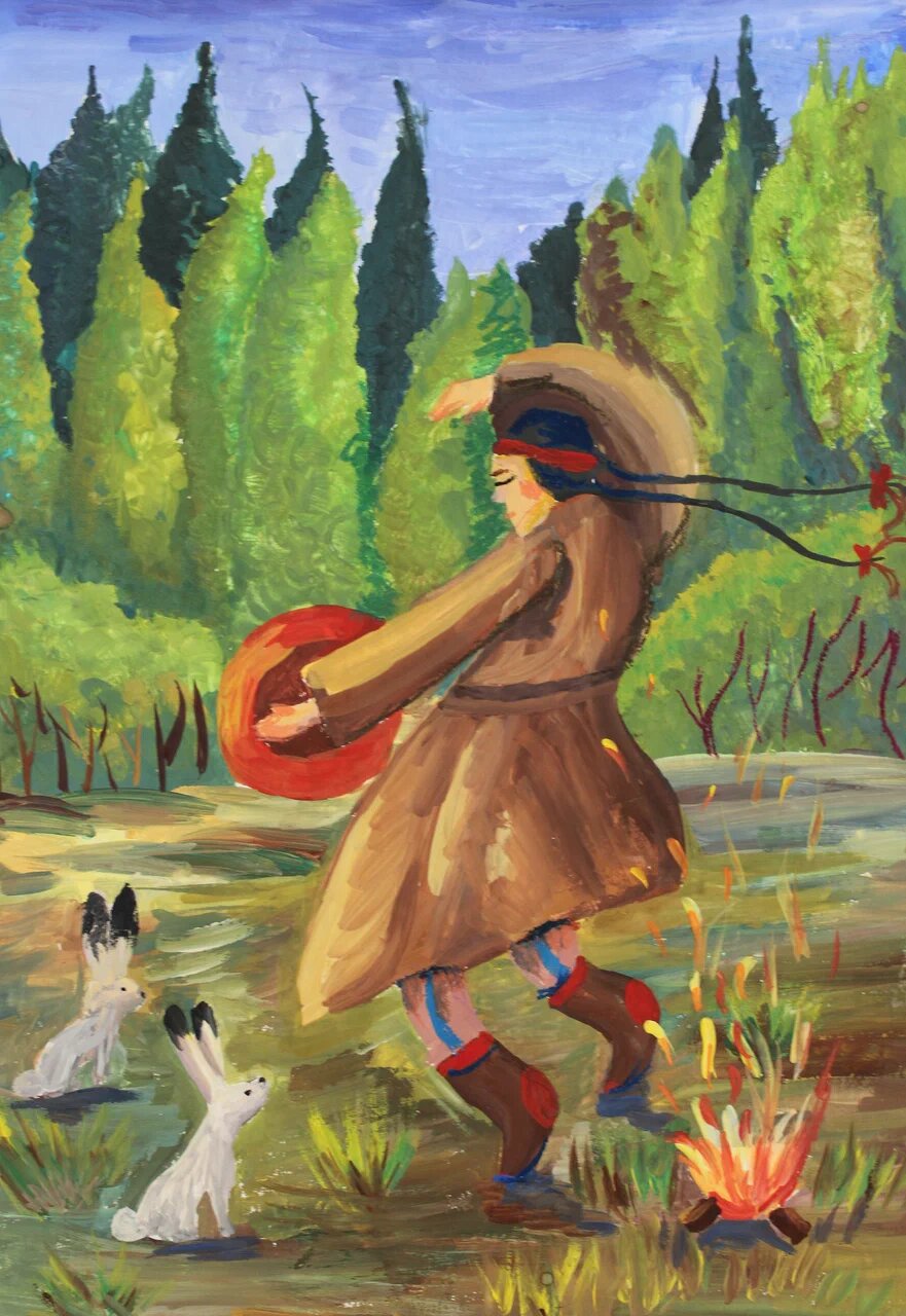 Аннотация: Я нарисовала иллюстрацию к таёжной сказке "Шаман и зайцы". Проиллюстрирован тот момент, когда шаман отгонял злую напасть, нападшую на всех животных тайги. Зайцы попросили шаман избавить животных от болезней, но засмеялись, когда шаман им помогал. В итоге шаман ударил палочкой по ушам, и стех пор кончики ушей у зайцев почернели.