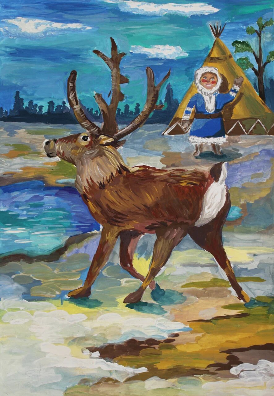 Аннотация: Мансийская сказка под названием "Гордый олень" повествует о том как зарождалась дружба между людьми и дикими северными оленями. Охотнику Захару в трудные времена помог дикий олень, и за это в подарок получил большие, красивые рога. Момент когда олень на прощанье встряхнул красивыми рогами и скроется в лесу я нарисовала в своей работе.